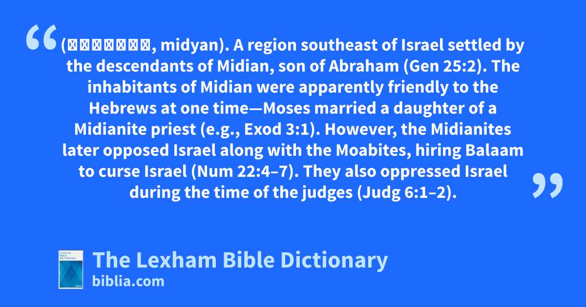 Midian (מִדְיָן, midyan). A region southeast of Israel settled by the descendants of Midian, son of Abraham (Gen 25:2). The inhabitants of Midian were apparently friendly to the Hebrews at one time—Moses married a daughter of a Midianite priest (e.g., Exod 3:1). However, the Midianites later opposed Israel along with the Moabites, hiring Balaam to curse Israel (Num 22:4–7). They also oppressed Israel during the time of the judges (Judg 6:1–2).