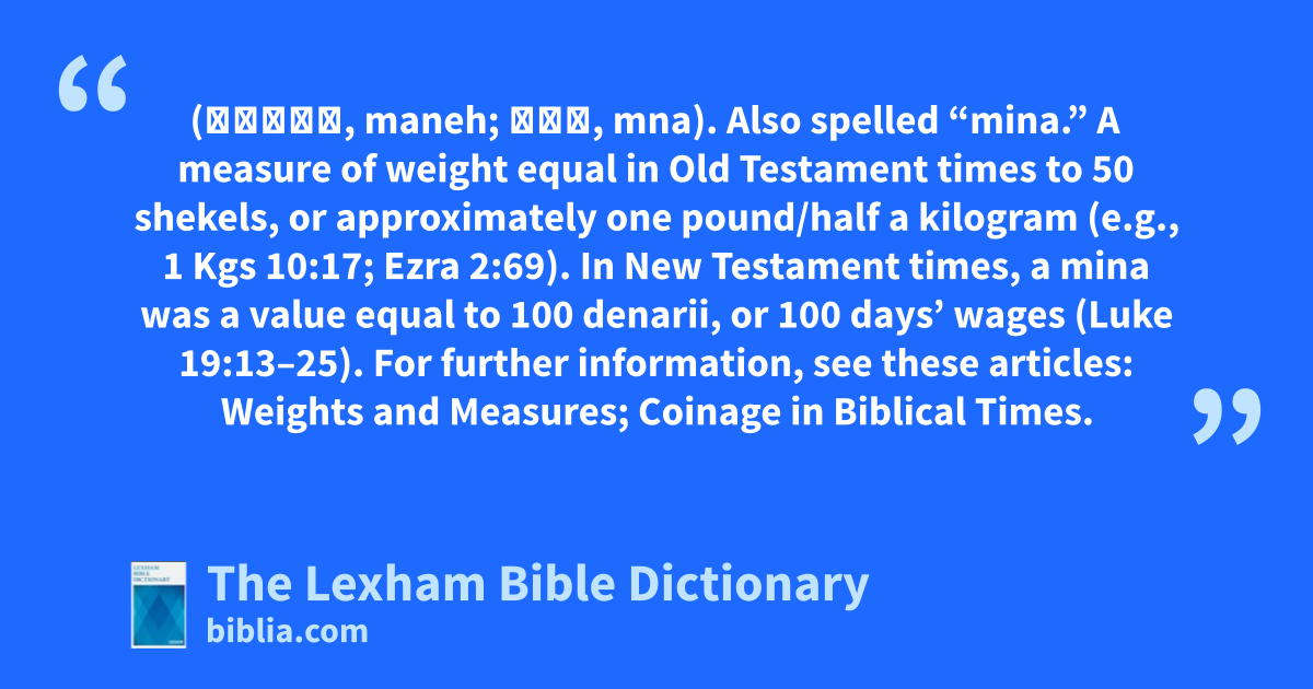 Minah (מָנֶה, maneh; μνᾶ, mna). Also spelled “mina.” A measure of weight equal in Old Testament times to 50 shekels, or approximately one pound/half a kilogram (e.g., 1 Kgs 10:17; Ezra 2:69). In New Testament times, a mina was a value equal to 100 denarii, or 100 days’ wages (Luke 19:13–25). For further information, see these articles: Weights and Measures; Coinage in Biblical Times.