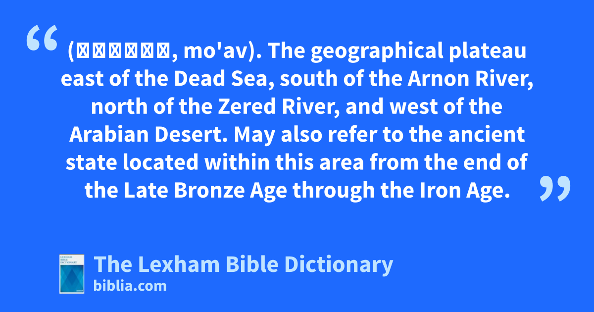Moab (מוֹאָב, mo'av). The geographical plateau east of the Dead Sea, south of the Arnon River, north of the Zered River, and west of the Arabian Desert. May also refer to the ancient state located within this area from the end of the Late Bronze Age through the Iron Age.