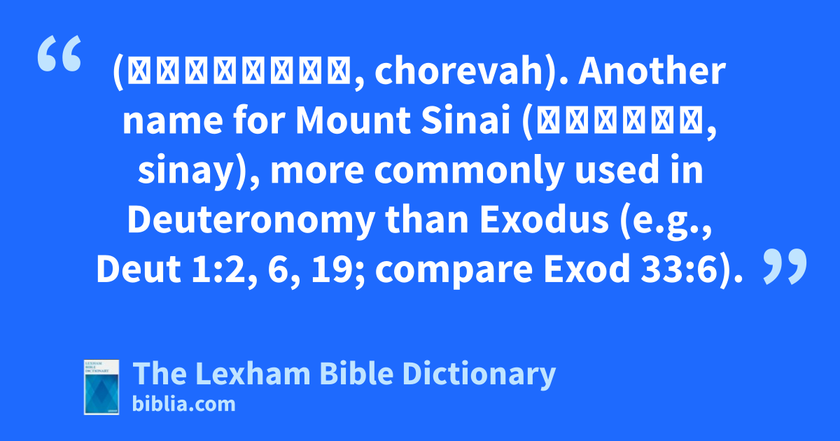 Horeb, Mount (חֹרֵֽבָה, chorevah). Another name for Mount Sinai (סִינַי, sinay), more commonly used in Deuteronomy than Exodus (e.g., Deut 1:2, 6, 19; compare Exod 33:6).