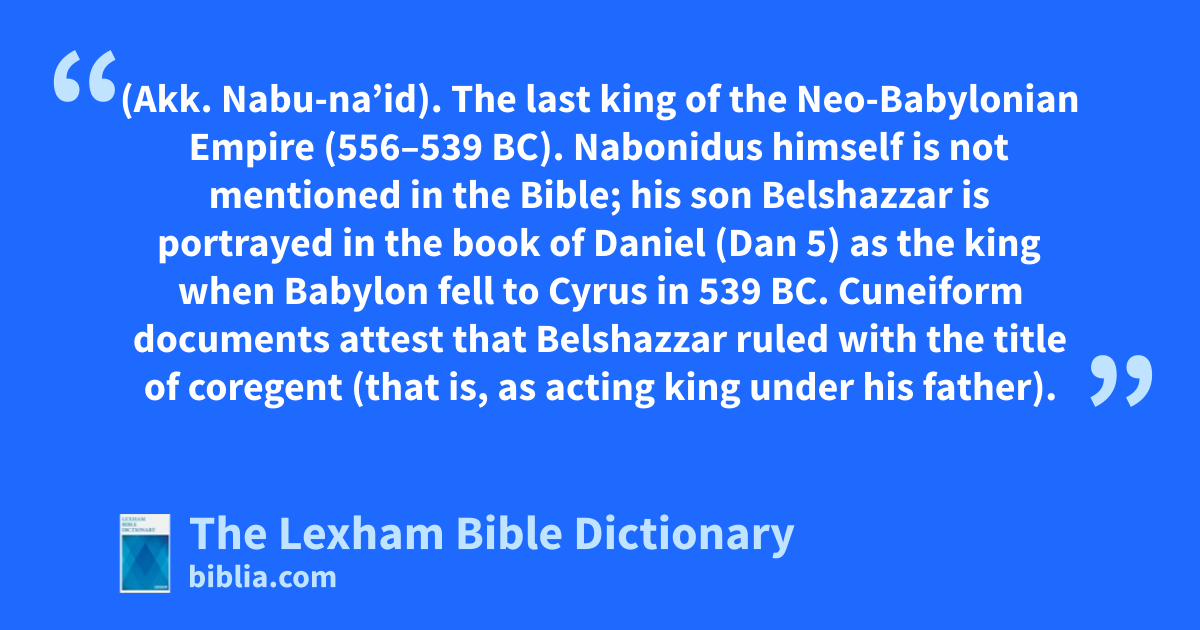 Nabonidus (Akk. Nabu-na’id). The last king of the Neo-Babylonian Empire (556–539 bc). Nabonidus himself is not mentioned in the Bible; his son Belshazzar is portrayed in the book of Daniel (Dan 5) as the king when Babylon fell to Cyrus in 539 bc. Cuneiform documents attest that Belshazzar ruled with the title of coregent (that is, as acting king under his father).