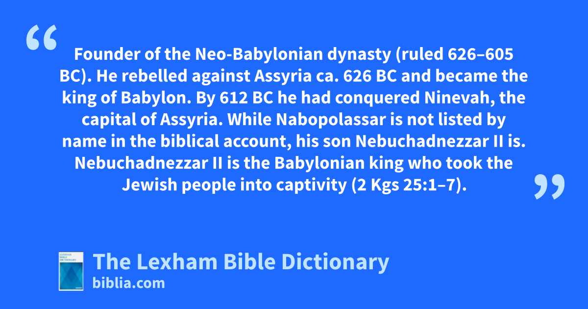 Nabopolassar Founder of the Neo-Babylonian dynasty (ruled 626–605 bc). He rebelled against Assyria ca. 626 bc and became the king of Babylon. By 612 bc he had conquered Ninevah, the capital of Assyria. While Nabopolassar is not listed by name in the biblical account, his son Nebuchadnezzar II is. Nebuchadnezzar II is the Babylonian king who took the Jewish people into captivity (2 Kgs 25:1–7).