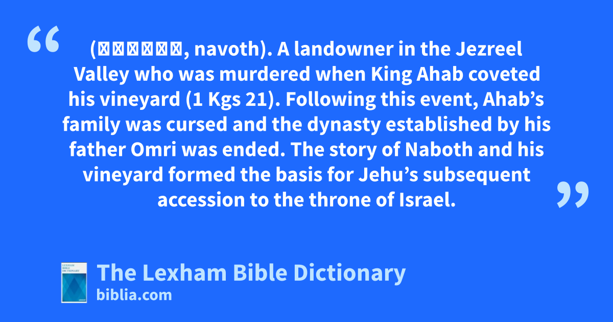 Naboth (נָבוֹת, navoth). A landowner in the Jezreel Valley who was murdered when King Ahab coveted his vineyard (1 Kgs 21).