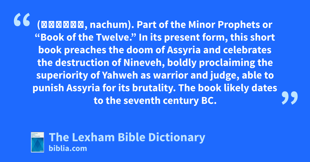 Nahum, Book Of (נַחוּם, nachum). Part of the Minor Prophets or “Book of the Twelve.” In its present form, this short book preaches the doom of Assyria and celebrates the destruction of Nineveh, boldly proclaiming the superiority of Yahweh as warrior and judge, able to punish Assyria for its brutality. The book likely dates to the seventh century bc.