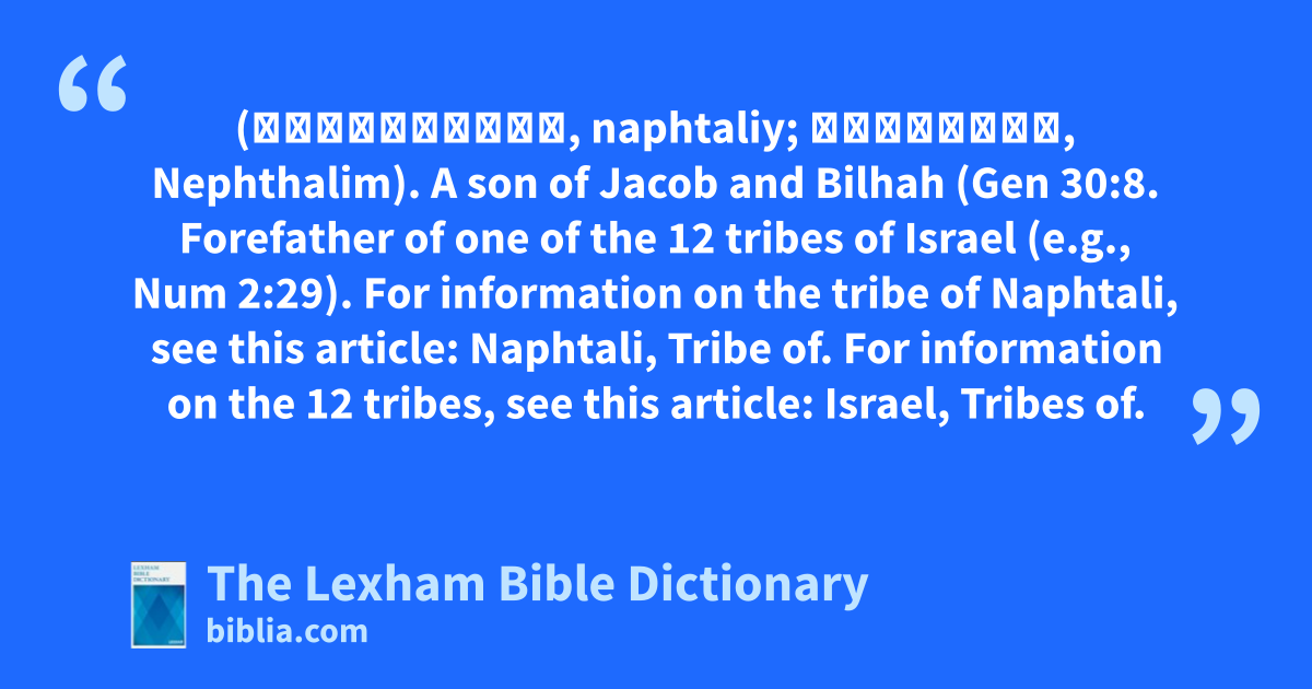 Naphtali, Son of Jacob (נַפְתָּלִי, naphtaliy; Νεφθαλίμ, Nephthalim). A son of Jacob and Bilhah (Gen 30:8. Forefather of one of the 12 tribes of Israel (e.g., Num 2:29). For information on the tribe of Naphtali, see this article: Naphtali, Tribe of. For information on the 12 tribes, see this article: Israel, Tribes of.