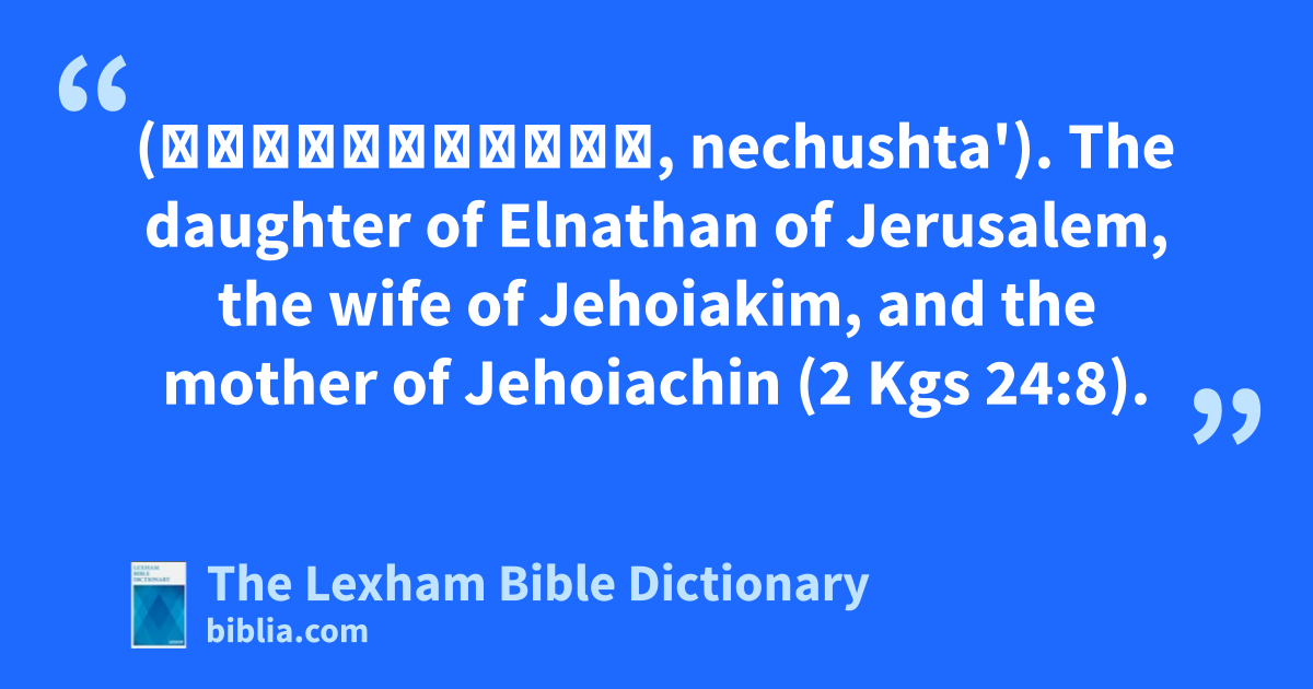 Nehushta, Daughter of Elnathan (נְחֻשְׁתָּא, nechushta'). The daughter of Elnathan of Jerusalem, the wife of Jehoiakim, and the mother of Jehoiachin (2 Kgs 24:8).