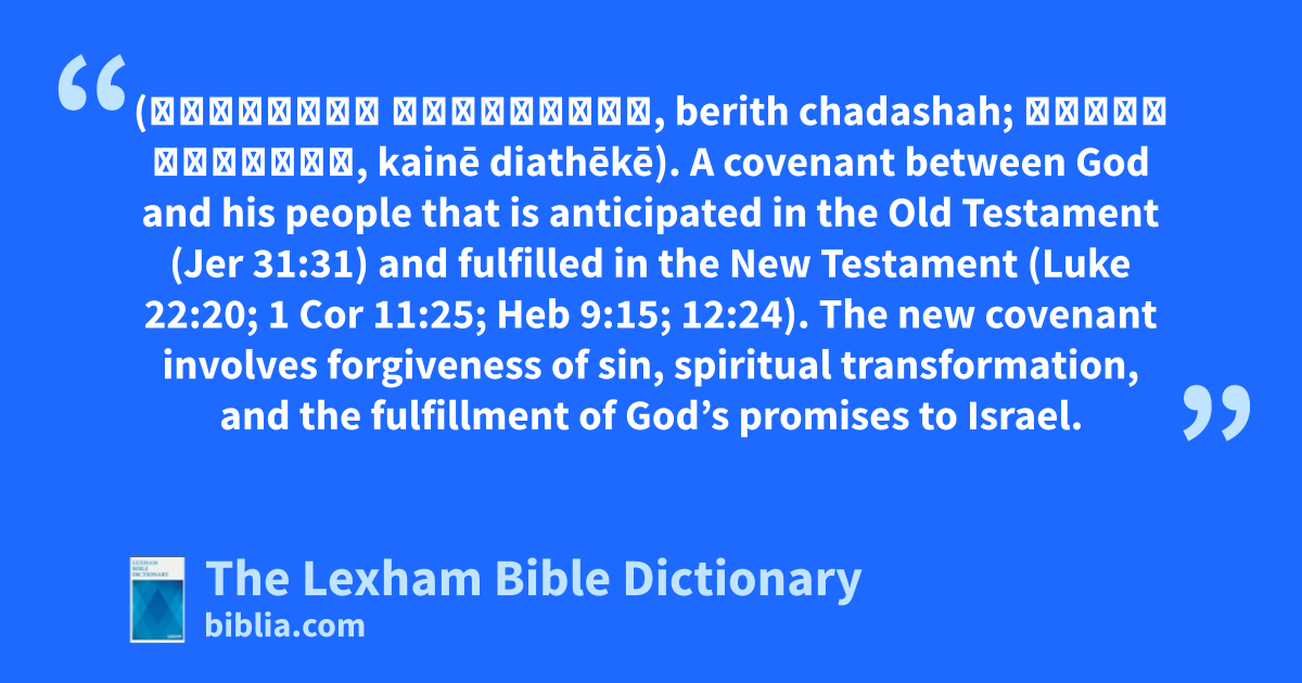 New Covenant (בְּרִ֥ית חֲדָשָֽׁה, berith chadashah; καινὴ διαθήκη, kainē diathēkē). A covenant between God and his people that is anticipated in the Old Testament (Jer 31:31) and fulfilled in the New Testament (Luke 22:20; 1 Cor 11:25; Heb 9:15; 12:24). The new covenant involves forgiveness of sin, spiritual transformation, and the fulfillment of God’s promises to Israel.