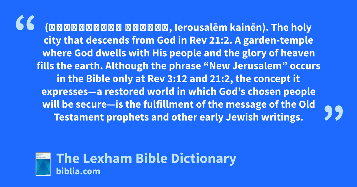 New Jerusalem (Ἰερουσαλὴμ καινὴν, Ierousalēm kainēn). The holy city that descends from God in Rev 21:2. A garden-temple where God dwells with His people and the glory of heaven fills the earth. Although the phrase “New Jerusalem” occurs in the Bible only at Rev 3:12 and 21:2, the concept it expresses—a restored world in which God’s chosen people will be secure—is the fulfillment of the message of the Old Testament prophets and other early Jewish writings.