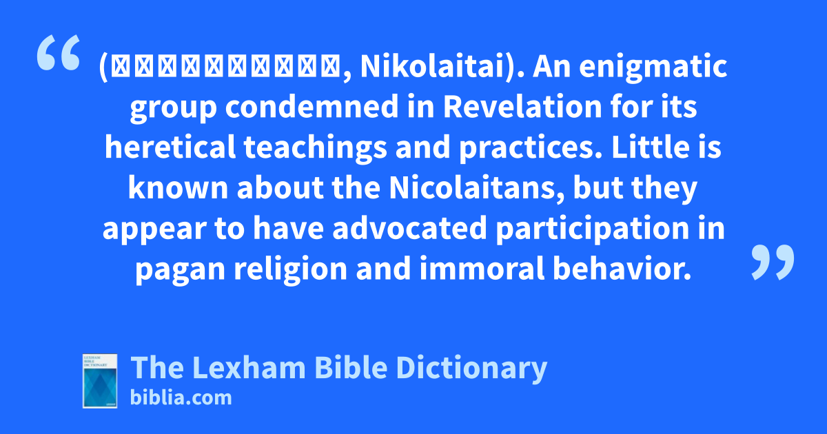 Nicolaitans (Νικολαΐται, Nikolaitai). An enigmatic group condemned in Revelation for its heretical teachings and practices. Little is known about the Nicolaitans, but they appear to have advocated participation in pagan religion and immoral behavior.