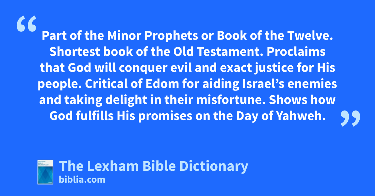 Obadiah, Book Of Part of the Minor Prophets or Book of the Twelve. Shortest book of the Old Testament. Proclaims that God will conquer evil and exact justice for His people. Critical of Edom for aiding Israel’s enemies and taking delight in their misfortune. Shows how God fulfills His promises on the Day of Yahweh.