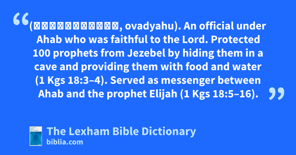 Obadiah the Governor (עֹבַדְיָהוּ, ovadyahu). An official under Ahab who was faithful to the Lord. Protected 100 prophets from Jezebel by hiding them in a cave and providing them with food and water (1 Kgs 18:3–4). Served as messenger between Ahab and the prophet Elijah (1 Kgs 18:5–16).