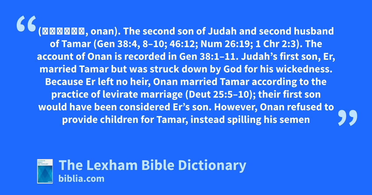 The account of Onan is recorded in Gen 38:1–11. Judah’s first son, Er, married Tamar but was struck down by God for his wickedness. Because Er left no heir, Onan married Tamar according to the practice of levirate marriage (Deut 25:5–10); their first son would have been considered Er’s son. However, Onan refused to provide children for Tamar, instead spilling his semen on the ground. Consequently, Onan, like his brother, was struck dead by Yahweh.