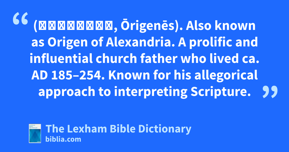 Origen (Ὠριγένης, Ōrigenēs). Also known as Origen of Alexandria. A prolific and influential church father who lived ca. ad 185–254. Known for his allegorical approach to interpreting Scripture.