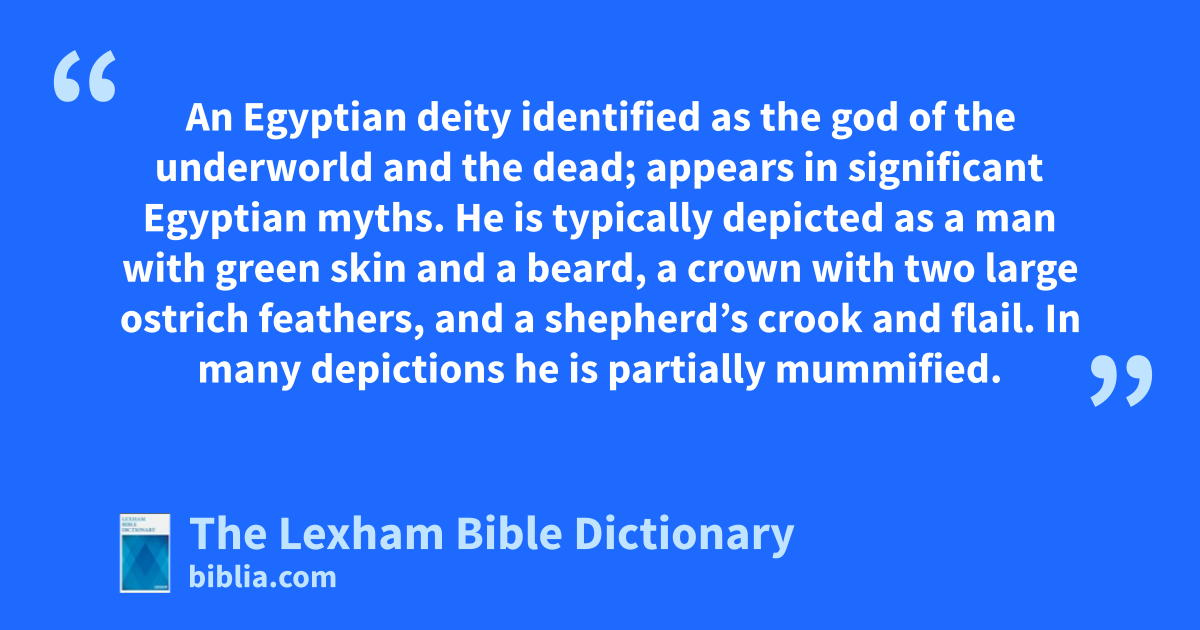 Osiris An Egyptian deity identified as the god of the underworld and the dead; appears in significant Egyptian myths. He is typically depicted as a man with green skin and a beard, a crown with two large ostrich feathers, and a shepherd’s crook and flail. In many depictions he is partially mummified.