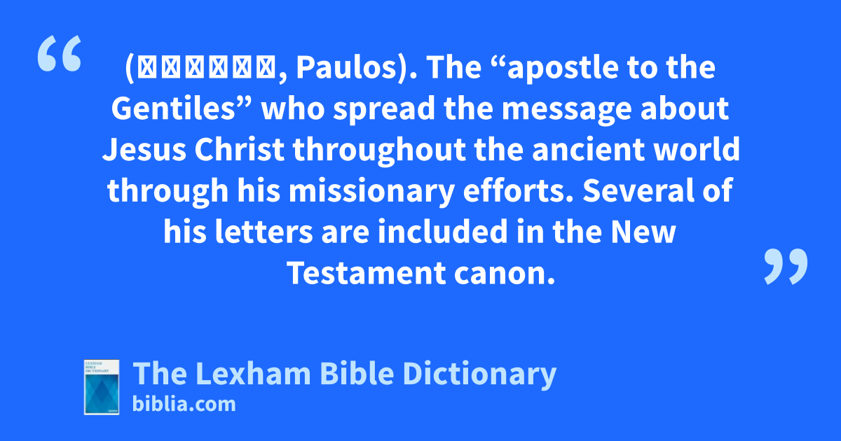 Paul the Apostle (Παῦλος, Paulos). The “apostle to the Gentiles” who spread the message about Jesus Christ throughout the ancient world through his missionary efforts. Several of his letters are included in the New Testament canon.