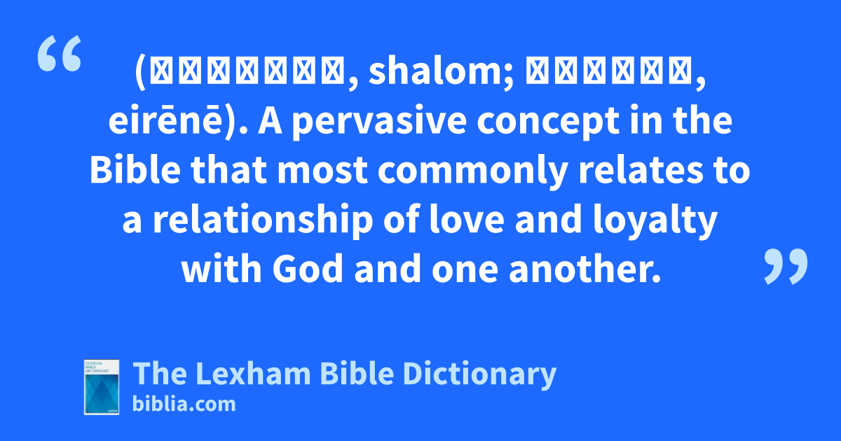 Peace (שָׁלוֹם, shalom; εἰρήνη, eirēnē). A pervasive concept in the Bible that most commonly relates to a relationship of love and loyalty with God and one another.