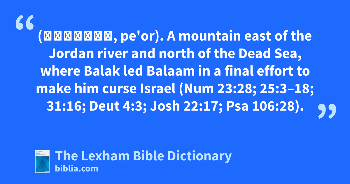 Peor, Mount (פְּעוֹר, pe'or). A mountain east of the Jordan river and north of the Dead Sea, where Balak led Balaam in a final effort to make him curse Israel (Num 23:28; 25:3–18; 31:16; Deut 4:3; Josh 22:17; Psa 106:28).
