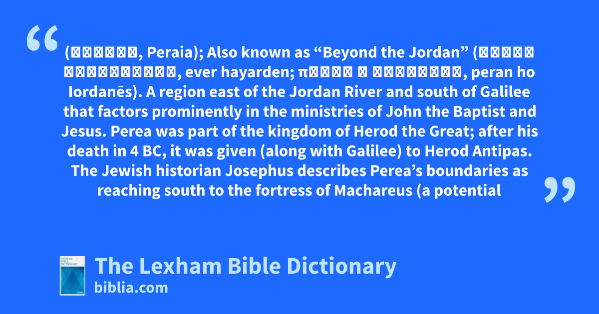 Perea (Περαία, Peraia); Also known as “Beyond the Jordan” (עֵבֶר הַיַרְדֵּן, ever hayarden; πέραν ὁ Ἰορδάνης, peran ho Iordanēs). A region east of the Jordan River and south of Galilee that factors prominently in the ministries of John the Baptist and Jesus. Perea was part of the kingdom of Herod the Great; after his death in 4 bc, it was given (along with Galilee) to Herod Antipas.