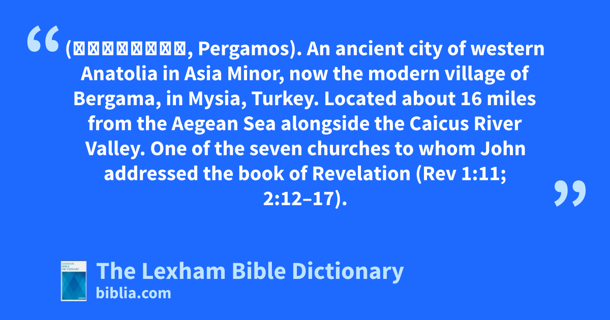 Pergamum (Πέργαμος, Pergamos). An ancient city of western Anatolia in Asia Minor, now the modern village of Bergama, in Mysia, Turkey. Located about 16 miles from the Aegean Sea alongside the Caicus River Valley. One of the seven churches to whom John addressed the book of Revelation (Rev 1:11; 2:12–17).