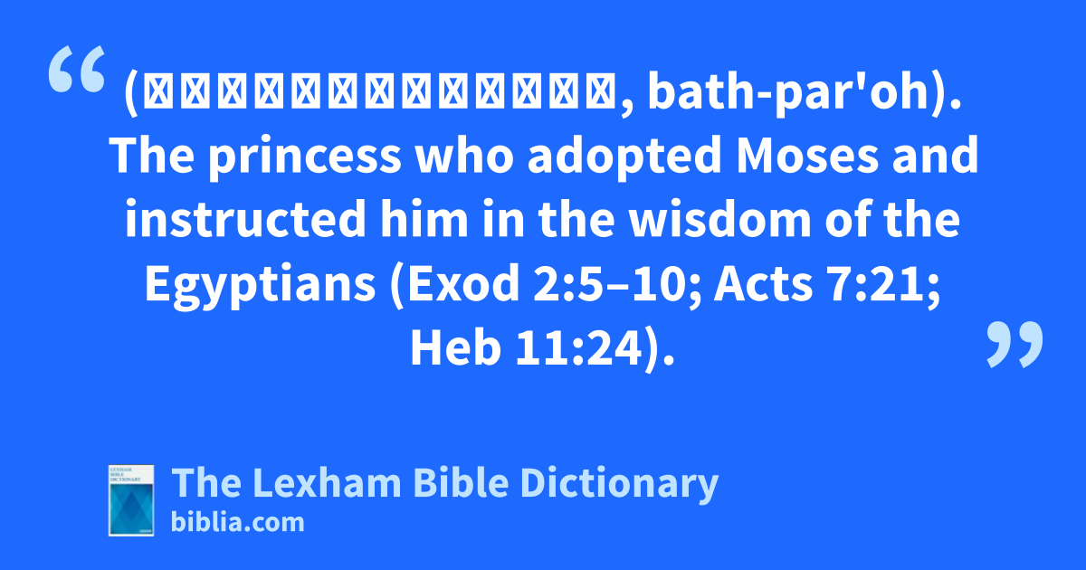 Pharaoh’s Daughter (בַּת־פַּרְעֹה, bath-par'oh). The princess who adopted Moses and instructed him in the wisdom of the Egyptians (Exod 2:5–10; Acts 7:21; Heb 11:24).