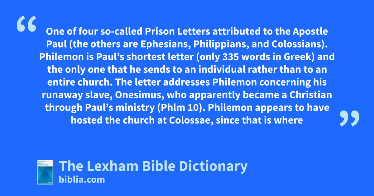 Philemon, Letter To One of four so-called Prison Letters attributed to the Apostle Paul (the others are Ephesians, Philippians, and Colossians). Philemon is Paul’s shortest letter (only 335 words in Greek) and the only one that he sends to an individual rather than to an entire church. The letter addresses Philemon concerning his runaway slave, Onesimus, who apparently became a Christian through Paul’s ministry (Phlm 10). Philemon appears to have hosted the church at Colossae, since that is where Paul sends Onesimus (Phlm 2; Col 4:8–9).