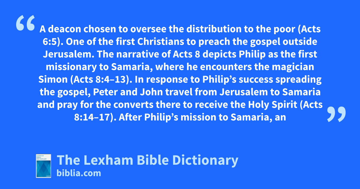 Philip the Evangelist A deacon chosen to oversee the distribution to the poor (Acts 6:5). One of the first Christians to preach the gospel outside Jerusalem.