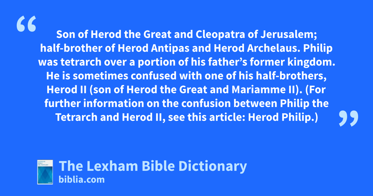 Philip the Tetrarch Son of Herod the Great and Cleopatra of Jerusalem; half-brother of Herod Antipas and Herod Archelaus. Philip was tetrarch over a portion of his father’s former kingdom. He is sometimes confused with one of his half-brothers, Herod II (son of Herod the Great and Mariamme II).