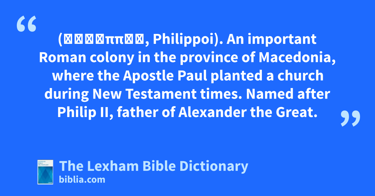Philippi (Φίλιπποι, Philippoi). An important Roman colony in the province of Macedonia, where the Apostle Paul planted a church during New Testament times. Named after Philip II, father of Alexander the Great.