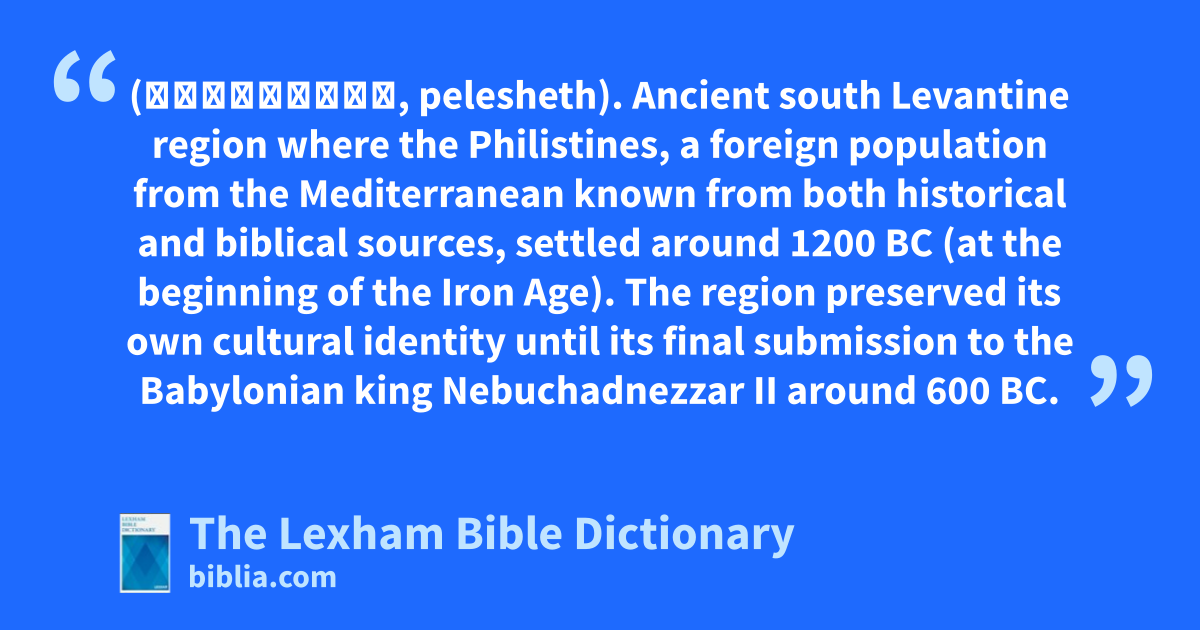 Philistia (פְּלֶשֶׁת, pelesheth). Ancient south Levantine region where the Philistines, a foreign population from the Mediterranean known from both historical and biblical sources, settled around 1200 bc (at the beginning of the Iron Age). The region preserved its own cultural identity until its final submission to the Babylonian king Nebuchadnezzar II around 600 bc.