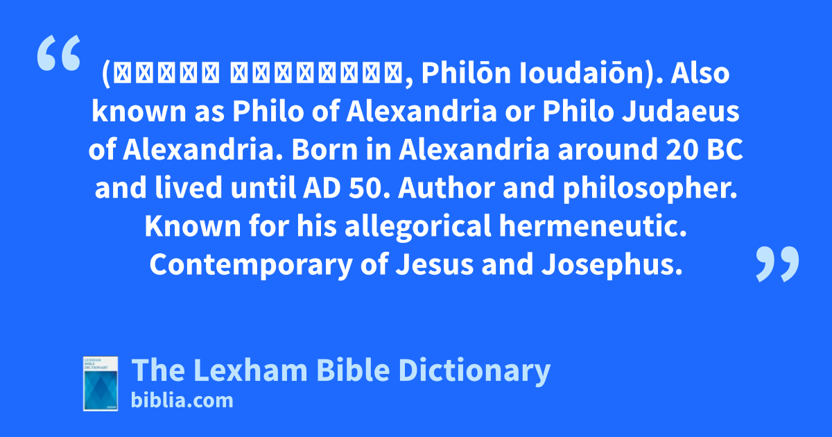Philo Judaeus (Φίλων Ἰουδαῖων, Philōn Ioudaiōn). Also known as Philo of Alexandria or Philo Judaeus of Alexandria. Born in Alexandria around 20 bc and lived until ad 50. Author and philosopher. Known for his allegorical hermeneutic. Contemporary of Jesus and Josephus.