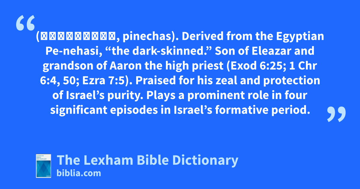 Phinehas, Son of Eleazar (פִּינְחָס, pinechas). Derived from the Egyptian Pe-nehasi, “the dark-skinned.” Son of Eleazar and grandson of Aaron the high priest (Exod 6:25; 1 Chr 6:4, 50; Ezra 7:5). Praised for his zeal and protection of Israel’s purity. Plays a prominent role in four significant episodes in Israel’s formative period.