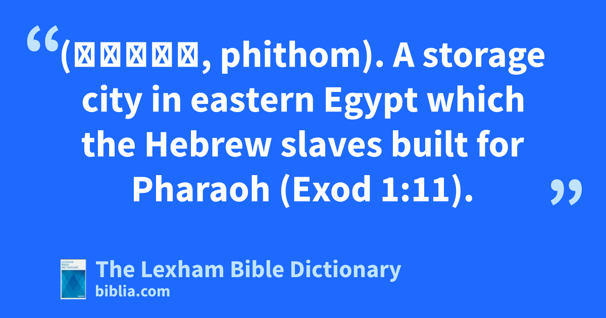 Pithom (פִתֹם, phithom). A storage city in eastern Egypt which the Hebrew slaves built for Pharaoh (Exod 1:11).
