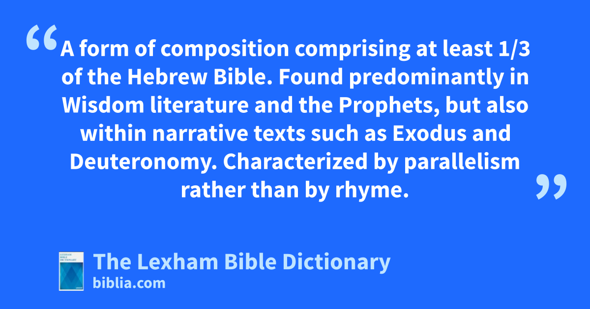 Poetry, Biblical A form of composition comprising at least 1/3 of the Hebrew Bible. Found predominantly in Wisdom literature and the Prophets, but also within narrative texts such as Exodus and Deuteronomy. Characterized by parallelism rather than by rhyme.