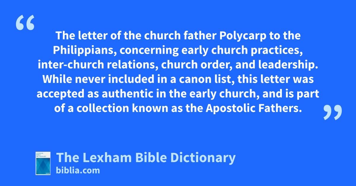 Polycarp, Letter Of The letter of the church father Polycarp to the Philippians, concerning early church practices, inter-church relations, church order, and leadership. While never included in a canon list, this letter was accepted as authentic in the early church, and is part of a collection known as the Apostolic Fathers.