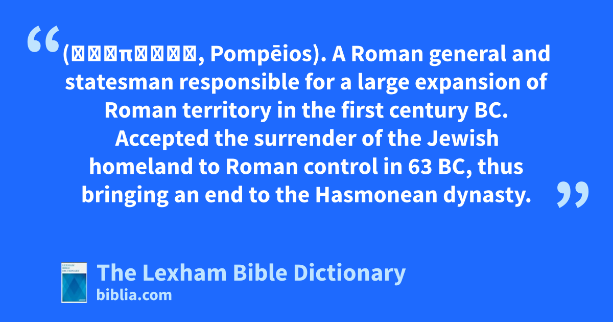 Pompey (Πομπήϊος, Pompēios). A Roman general and statesman responsible for a large expansion of Roman territory in the first century bc. Accepted the surrender of the Jewish homeland to Roman control in 63 bc, thus bringing an end to the Hasmonean dynasty.