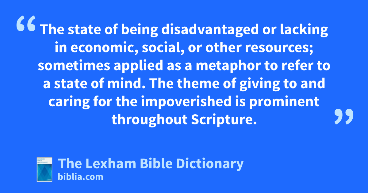 Poverty The state of being disadvantaged or lacking in economic, social, or other resources; sometimes applied as a metaphor to refer to a state of mind. The theme of giving to and caring for the impoverished is prominent throughout Scripture.