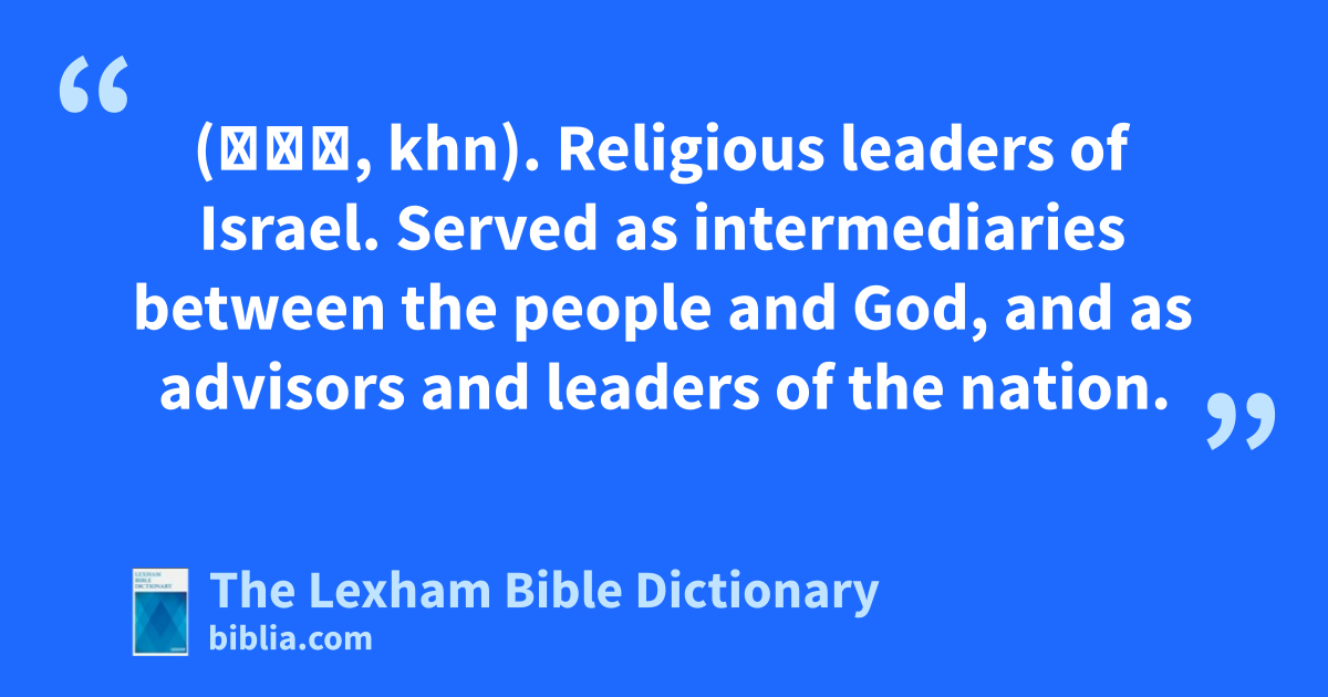 Priest (כהן, khn). Religious leaders of Israel. Served as intermediaries between the people and God, and as advisors and leaders of the nation.