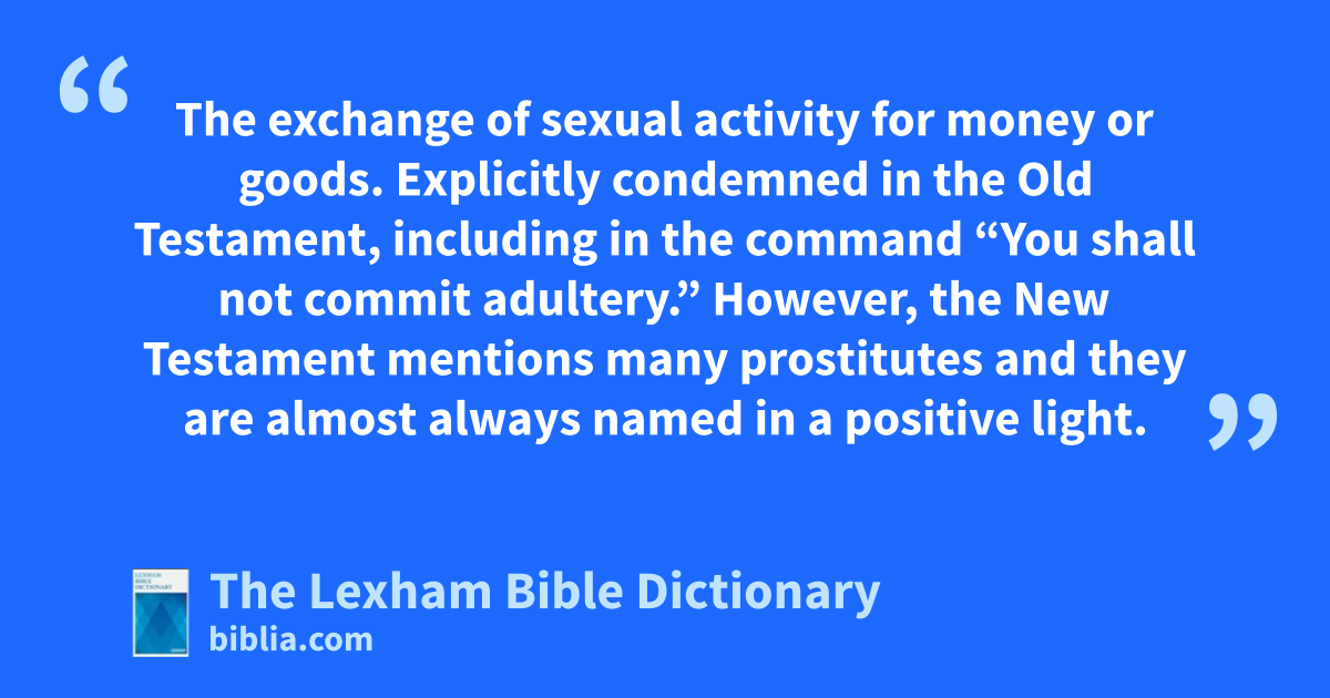Prostitution The exchange of sexual activity for money or goods. Explicitly condemned in the Old Testament, including in the command “You shall not commit adultery.” However, the New Testament mentions many prostitutes and they are almost always named in a positive light.