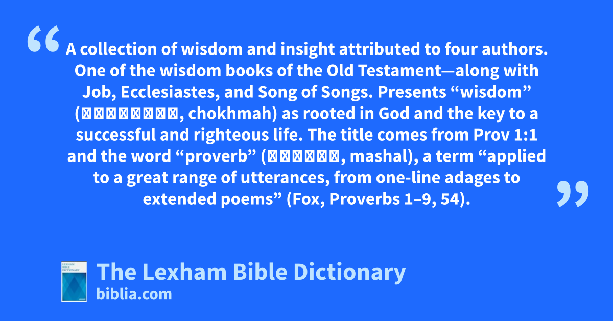 Proverbs, Book Of A collection of wisdom and insight attributed to four authors. One of the wisdom books of the Old Testament—along with Job, Ecclesiastes, and Song of Songs. Presents “wisdom” (חָכְמָ֣ה, chokhmah) as rooted in God and the key to a successful and righteous life.