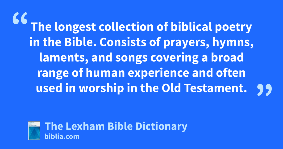 Psalms, Book Of The longest collection of biblical poetry in the Bible. Consists of prayers, hymns, laments, and songs covering a broad range of human experience and often used in worship in the Old Testament.