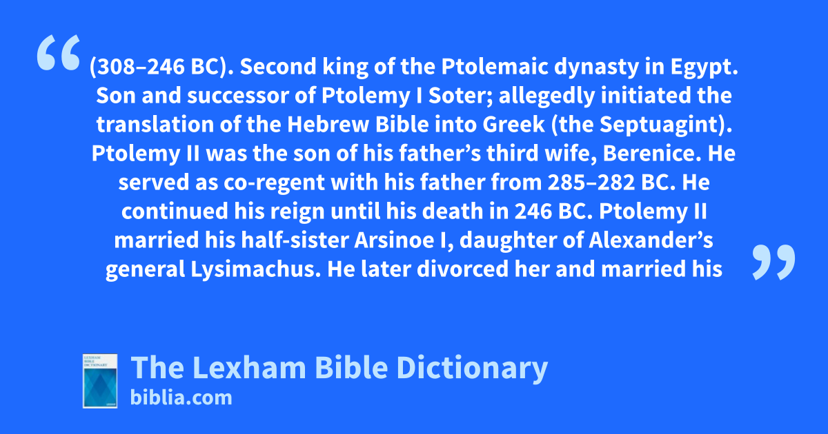 Ptolemy II Philadelphus (308–246 bc). Second king of the Ptolemaic dynasty in Egypt. Son and successor of Ptolemy I Soter; allegedly initiated the translation of the Hebrew Bible into Greek (the Septuagint).