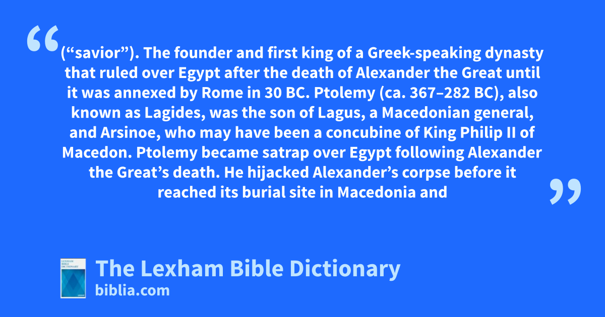Ptolemy (ca. 367–282 bc), also known as Lagides, was the son of Lagus, a Macedonian general, and Arsinoe, who may have been a concubine of King Philip II of Macedon. Ptolemy became satrap over Egypt following Alexander the Great’s death. He hijacked Alexander’s corpse before it reached its burial site in Macedonia and relocated it to Memphis, Egypt, while he built a suitable tomb for him in Alexandria. In 319 bc he attempted to gain control of Syria-Palestine. Although he failed in this endeavor, he took many Jewish prisoners of war—the beginnings of a great Jewish community in Alexandria.
