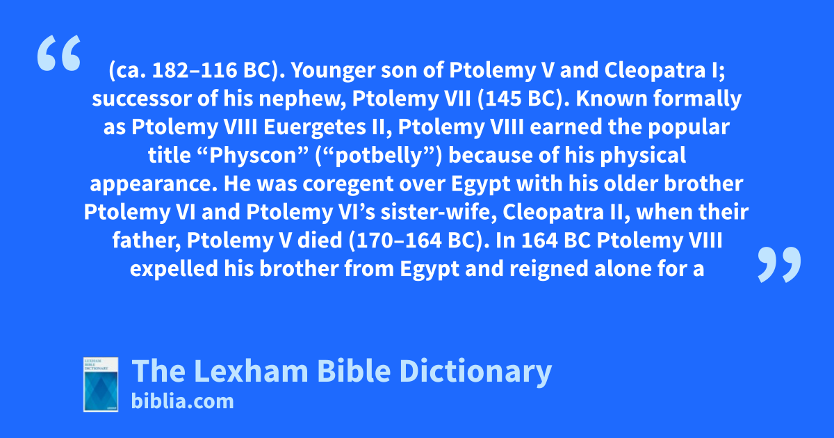 Ptolemy VIII Physcon (ca. 182–116 bc). Younger son of Ptolemy V and Cleopatra I; successor of his nephew, Ptolemy VII (145 bc).