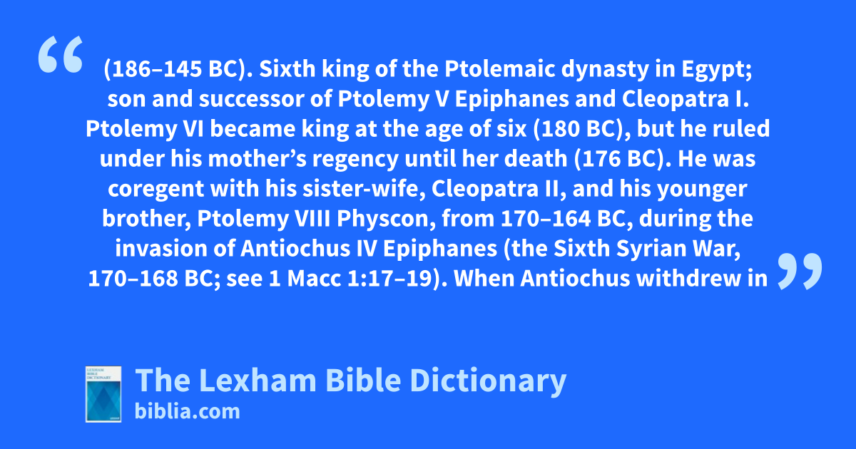 Ptolemy VI became king at the age of six (180 bc), but he ruled under his mother’s regency until her death (176 bc). He was coregent with his sister-wife, Cleopatra II, and his younger brother, Ptolemy VIII Physcon, from 170–164 bc, during the invasion of Antiochus IV Epiphanes (the Sixth Syrian War, 170–168 bc; see 1 Macc 1:17–19). When Antiochus withdrew in 168 bc, under the compulsion of the Roman Senate, a power struggle between Philometor and Physcon resulted in Philometor’s expulsion from Egypt in 164 bc. He was reinstated by Rome in 163 bc.
