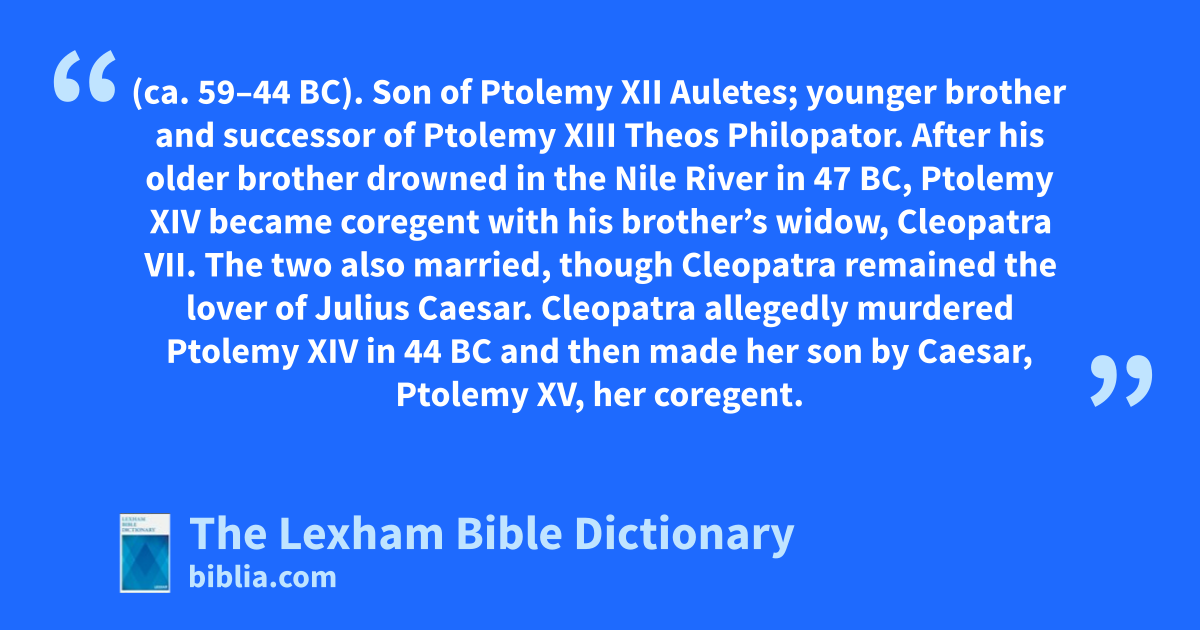 After his older brother drowned in the Nile River in 47 bc, Ptolemy XIV became coregent with his brother’s widow, Cleopatra VII. The two also married, though Cleopatra remained the lover of Julius Caesar. Cleopatra allegedly murdered Ptolemy XIV in 44 bc and then made her son by Caesar, Ptolemy XV, her coregent.