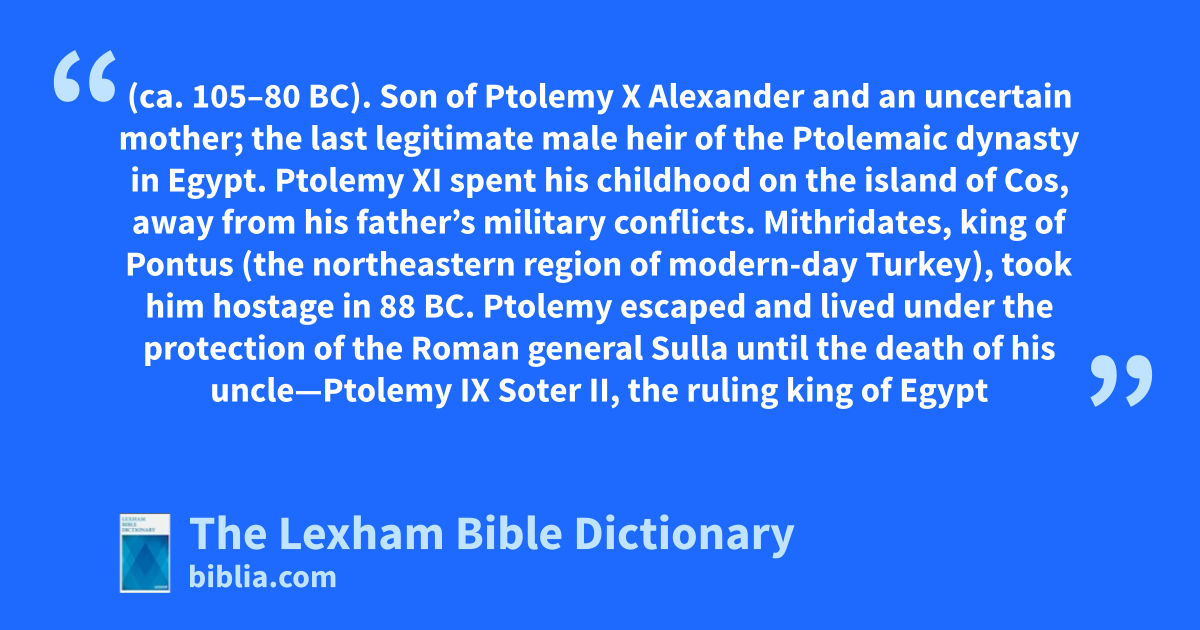 Ptolemy XI spent his childhood on the island of Cos, away from his father’s military conflicts. Mithridates, king of Pontus (the northeastern region of modern-day Turkey), took him hostage in 88 bc. Ptolemy escaped and lived under the protection of the Roman general Sulla until the death of his uncle—Ptolemy IX Soter II, the ruling king of Egypt—in 81 bc.