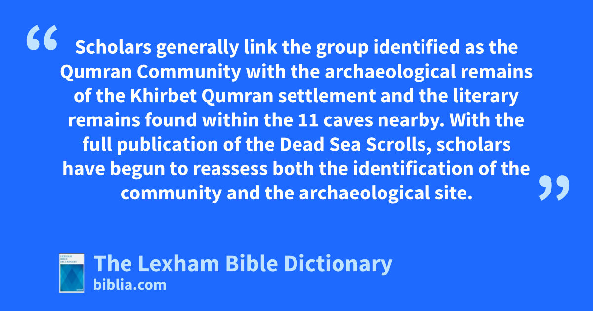 Qumran, Community Of Scholars generally link the group identified as the Qumran Community with the archaeological remains of the Khirbet Qumran settlement and the literary remains found within the 11 caves nearby. With the full publication of the Dead Sea Scrolls, scholars have begun to reassess both the identification of the community and the archaeological site.