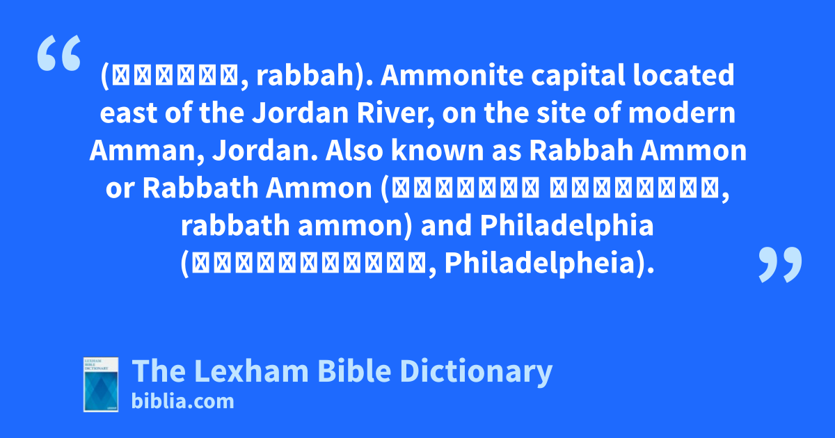 Rabbah (רַבָּה, rabbah). Ammonite capital located east of the Jordan River, on the site of modern Amman, Jordan. Also known as Rabbah Ammon or Rabbath Ammon (רַבַּ֖ת עַמּ֑וֹן, rabbath ammon) and Philadelphia (Φιλαδέλφεια, Philadelpheia).