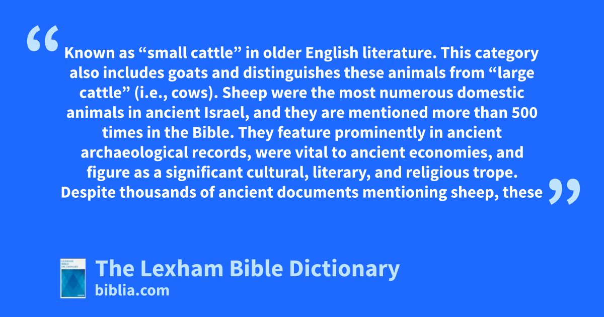 Sheep Known as “small cattle” in older English literature. This category also includes goats and distinguishes these animals from “large cattle” (i.e., cows). Sheep were the most numerous domestic animals in ancient Israel, and they are mentioned more than 500 times in the Bible. They feature prominently in ancient archaeological records, were vital to ancient economies, and figure as a significant cultural, literary, and religious trope. Despite thousands of ancient documents mentioning sheep, these animals were not usually included in artistic depictions (von Soden, Ancient Orient, 95).