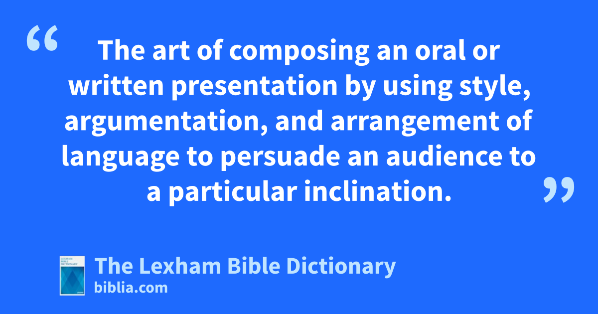 Rhetoric The art of composing an oral or written presentation by using style, argumentation, and arrangement of language to persuade an audience to a particular inclination.